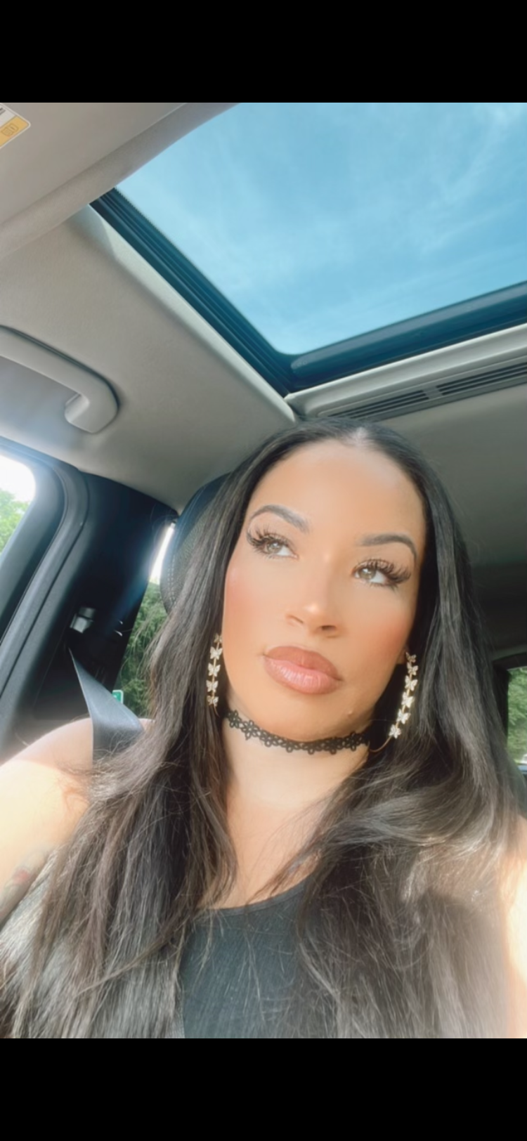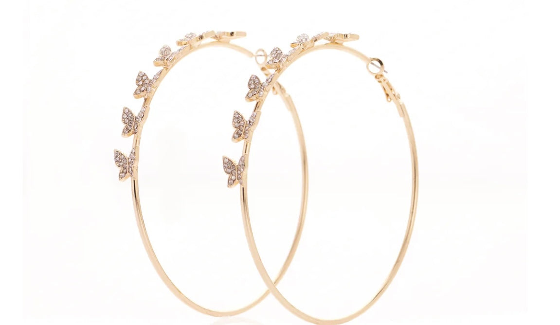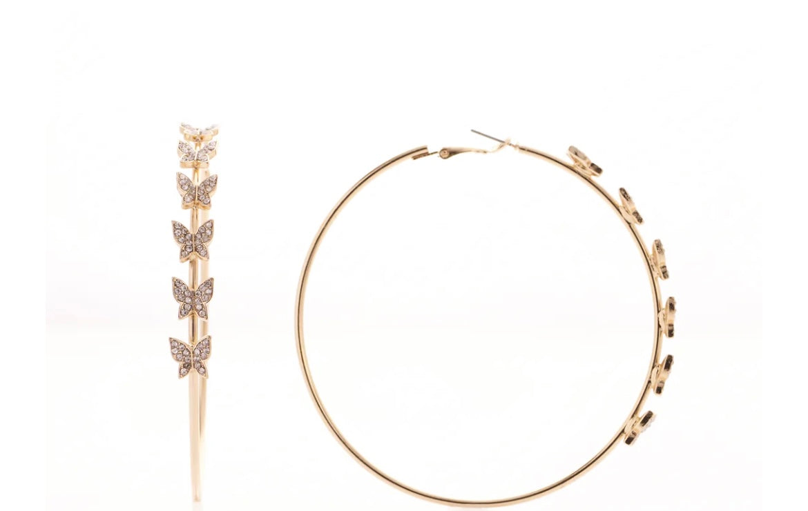 Gold Hoop earrings with six encrusted butterfly’s going down with rhinestones.